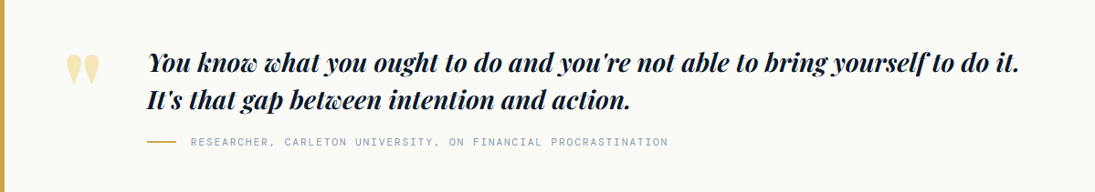 Research on procrastination and personal finance confirms what the data shows: procrastinators are significantly less likely to participate in savings plans, tend to initiate saving later, and are less likely to save a fixed amount every month. Procrastinators are also about nine percentage points less likely to have a will or trust, and report lower retirement satisfaction overall.[10] The delay doesn't just cost money. It costs peace of mind. (Funny enough, I wrote about exactly this. Read it here.)