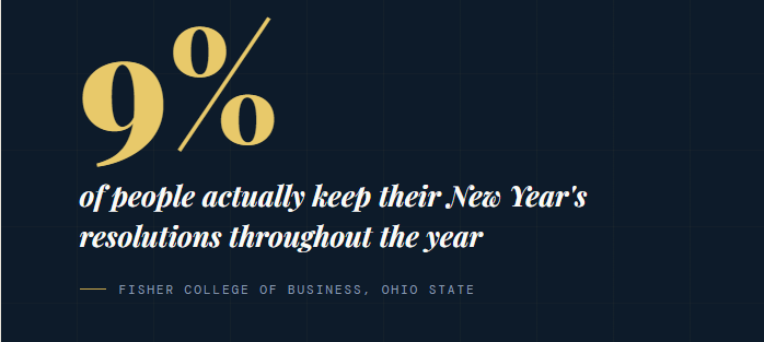 Research shows that only 9% of people actually keep their New Year's resolutions throughout the year.[1] Nine. Percent. That means 91 out of every 100 people who made a big, bold declaration on January 1st are quietly abandoning ship. And it doesn't take long: 23% quit within the first week, and 64% have thrown in the towel by the end of the first month.[2] Strava, a fitness tracking app with hundreds of millions of data points, named the second Friday of January "Quitter's Day," because it's the single most popular day for people to give up on their goals.[2]