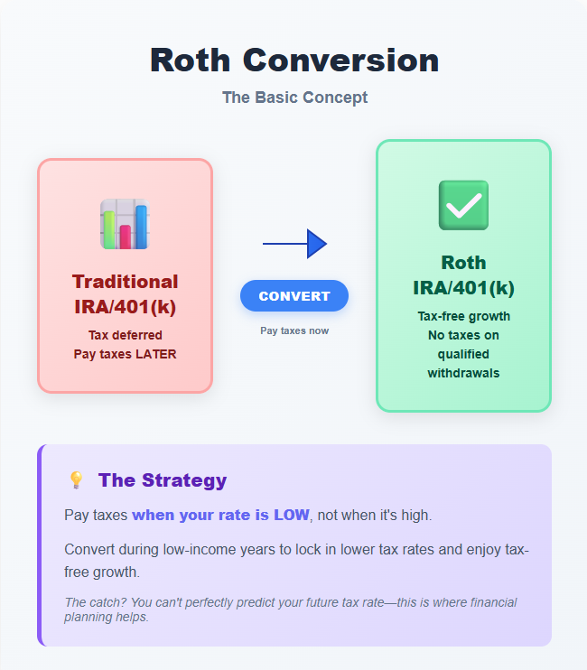 Roth conversion: Moving money from traditional → Roth. You pay taxes on the amount you convert this year, but then it's tax-free as it grows in the Roth account.1