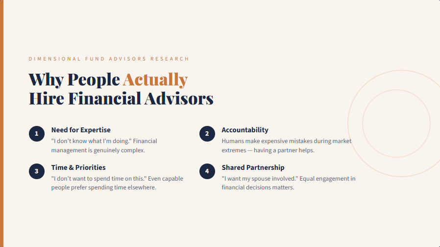 Dimensional Fund Advisors research identified four reasons families hire advisors:¹