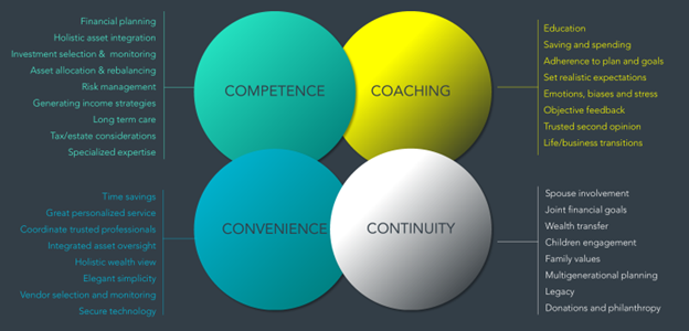 Professional advisors facilitate spouse involvement, children's financial education, wealth transfer, philanthropy, multigenerational planning, and legacy creation.