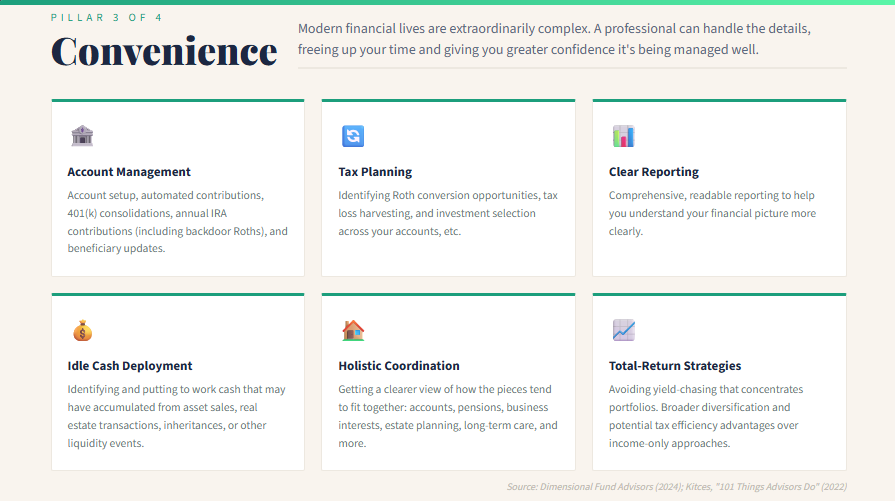 Investment selection is part of professional management. But comprehensive planning, behavioral coaching, tax optimization, administrative execution, and coordinated oversight typically create the most significant impact.