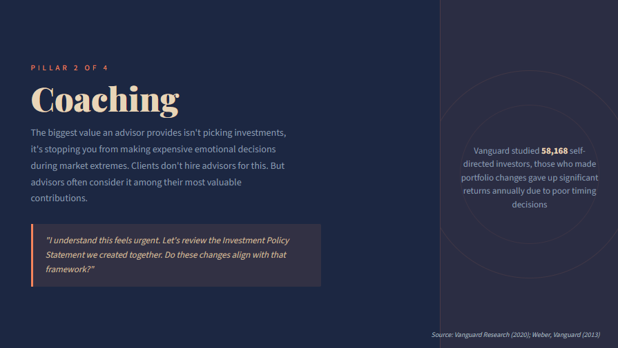 Behavioral coaching adds approximately 150 basis points annually, the single most valuable service advisors provide.⁸