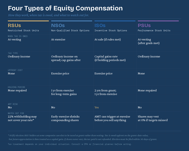 Figure 1: RSUs, NSOs, ISOs, and PSUs side by side. When tax is owed, what type of tax applies, and what to watch out for.