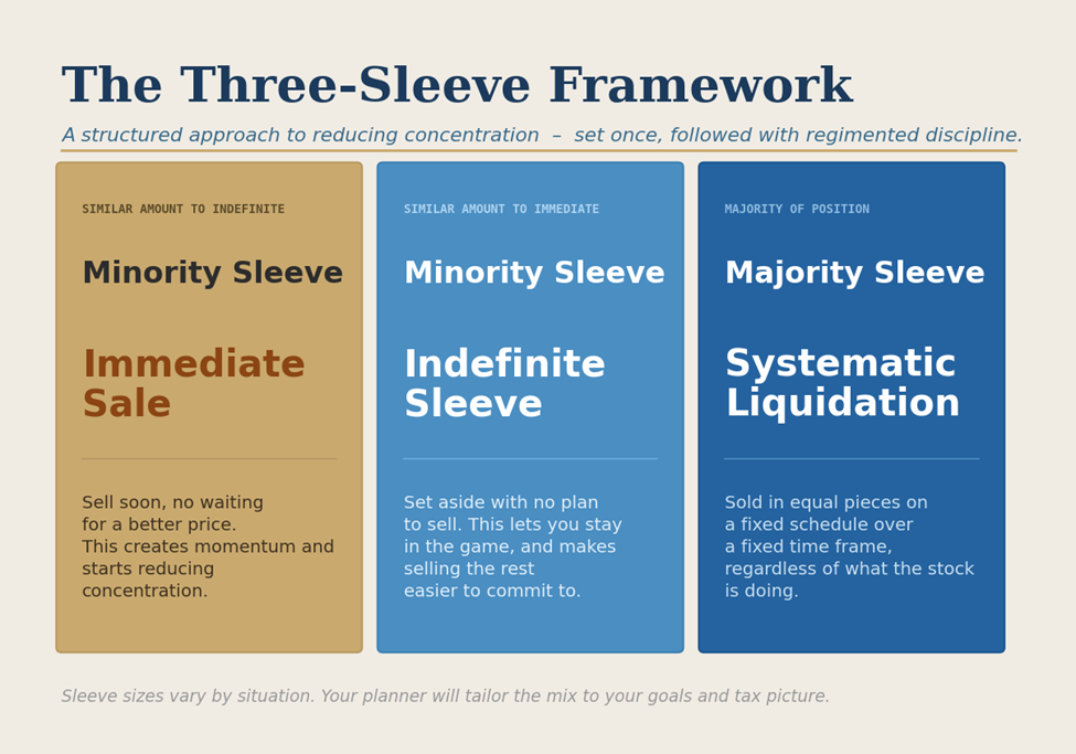 Figure 3: The Three-Sleeve Framework, a structured approach for systematically reducing a concentrated stock position. Systematic Liquidation is the largest sleeve; Immediate Sale and Indefinite Sleeve are typically similar in size. Your planner will tailor the mix to your goals and tax picture.