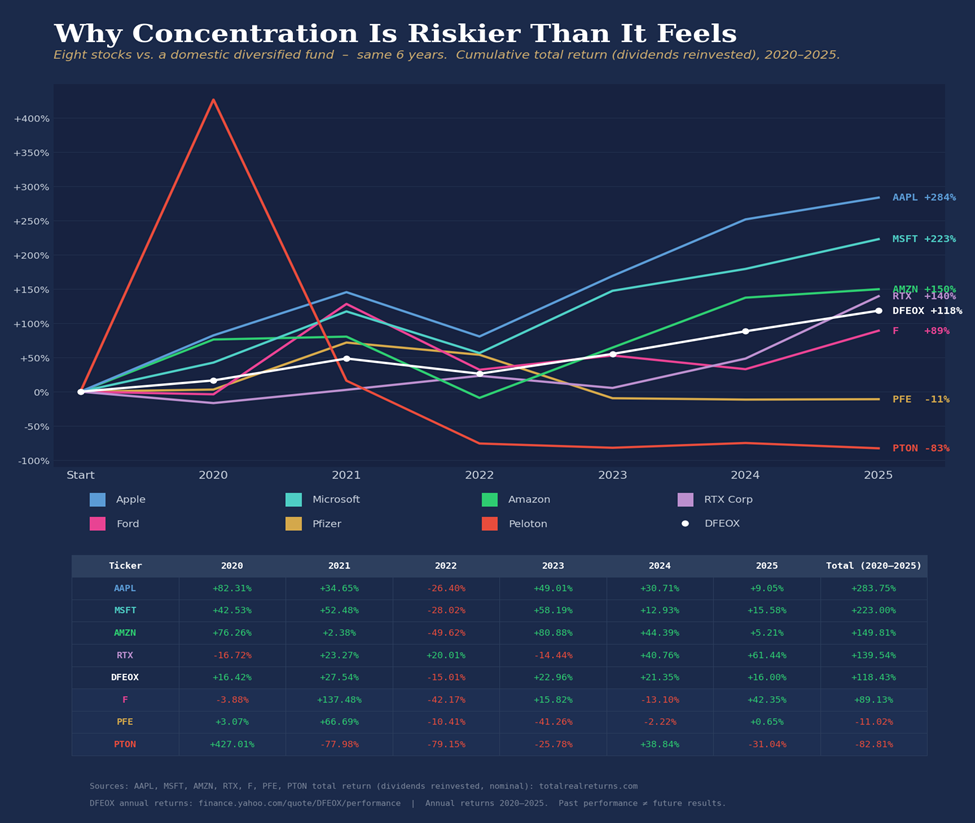 What the chart shows is that outcomes would have varied depending on which stock you happened to hold (if you held one of them). Apple and Microsoft both ended up towards the top over the full period, but each fell roughly 26-28% in 2022, which means even the highest performers in the period had rough patches. RTX also outpaced the fund (eventually). Amazon performed a little better, but with a bumpier ride. Peloton (which was up over 400% at its peak in 2020) collapsed to an 82% cumulative loss by 2025. Ford spiked +137% in 2021 on EV optimism, then gave back most of it the following year, and eventually trailed the fund over the full six years. Pfizer surged +67% in 2021 on vaccine demand, then spent the next four years in decline, ending with a negative total return including dividends. (If you want to see more cautionary tales of volatility from brands you probably recognize, just go look up AMC, Boeing, Bed Bath & Beyond, Anheiser Busch, etc….)