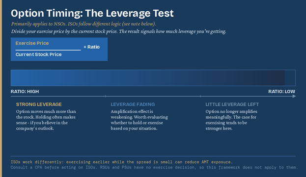 The leverage test is a way to gauge how much of that amplification you’re getting on your stock option. Divide your exercise price by the current stock price. When that ratio is high, the option still moves a lot more than the stock, which means you’re getting real leverage from holding. As it falls, that amplification fades, and the case for exercising tends to get stronger. That said, the ratio is only part of the picture. The company’s health and trajectory matter too, and a high ratio may not be as meaningful if there are real questions about where the business is headed (remember the whole concentration thing we just finished talking about).